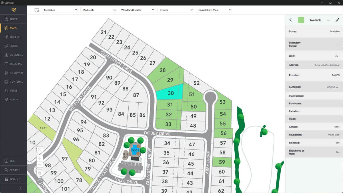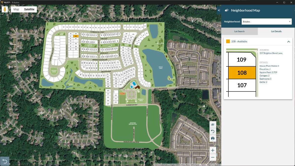 - Interactive, bird’s-eye view of the community with filterable lot-level data.